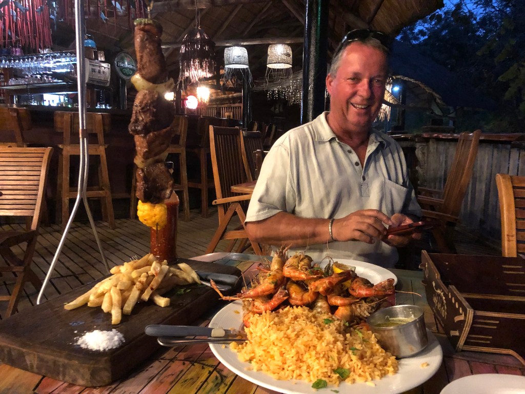 On Terry’s recommendation we were sure to be at Cafe Del Rio, on the banks of the Zambezi for sunset. Yet another weather conspiracy. No sunset, only clouds. Oh well, the setting was perfect, the food delicious and the Gin cold. We watched facinated as mokoro skippers navigated the Zambezi current. One man with a death wish paddled furiously with the lid of a container as his only paddle. Make em tuff in Africa.